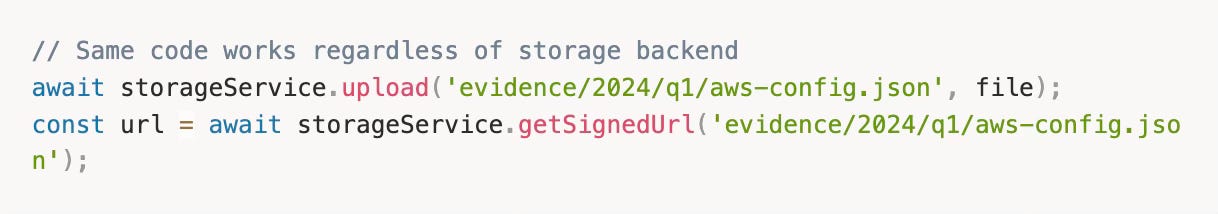 Storage abstraction. Evidence files might live on local disk, S3-compatible storage (RustFS), or Azure Blob. The shared storage service provides a consistent interface: