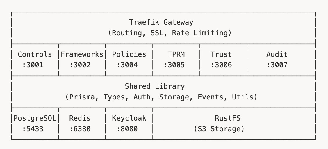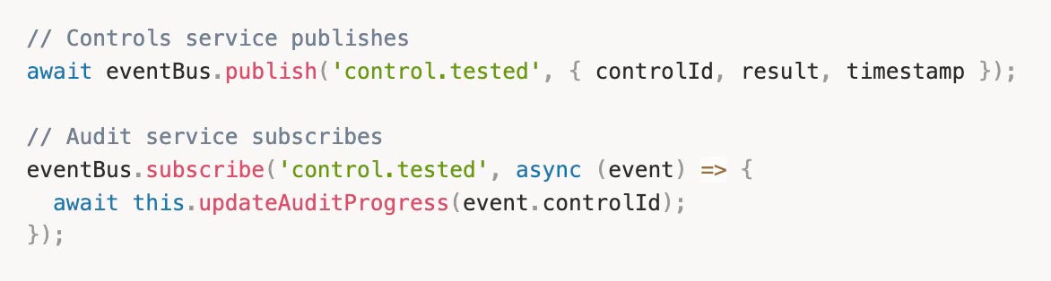 Each service owns its domain completely. The Controls service doesn't know how vendor assessments work. The Audit service doesn't care about policy approval workflows. They communicate through well-defined APIs and a shared event bus when necessary.