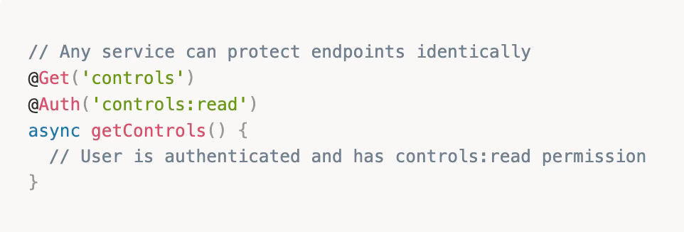 Type definitions. Shared TypeScript types ensure the Controls service and Audit service agree on what a “control” looks like. No runtime surprises from schema drift.